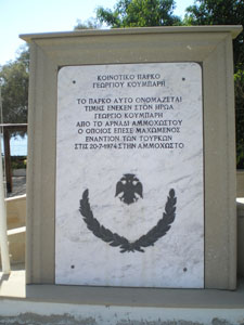 Πρόκειται για μια μαρμάρινη πλάκα με εγχάρακτη επιγραφή. Το Μνημείο αναγέρθηκε το 2004 από το Κοινοτικό Συμβούλιο Ζυγίου σε συνεργασία με την οικογένεια του ήρωα. Την ίδια χρονιά τελέστηκαν τα αποκαλυπτήρια από τον Υπουργό Άμυνας, κ. Μαυρονικόλα. Ακολουθεί ένα σύντομο βιογραφικό του ήρωα. Ο Γεώργιος Κουμπαρής, γόνος οικογένειας που ξεχώρισε στους εθνικούς αγώνες. Πατέρας του ο Ανδρέας Κουμπαρής από το χωριό Λιμνιά Αμμοχώστου και μητέρα του η Περσεφόνη Κουμπαρή. Παιδί πολυμελούς οικογένειας, αποτελούμενης από τέσσερα αγόρια και τέσσερα κορίτσια, και ο μικρότερος από τα αγόρια. Γεννήθηκε στο χωριό Αρναδί της επαρχίας Αμμοχώστου και από μικρός ξεχώριζε για τον πατριωτισμό και τα ελληνοχριστιανικά του ιδεώδη. Φοίτησε στην Ξενοδοχειακή Σχολή Αμμοχώστου και αμέσως μετά κατετάγη στην Εθνική Φρουρά όπου υπηρέτησε με το βαθμό του λοχία στην Ανωτέρα Διοίκηση Αμμοχώστου. Την ημέρα της εισβολής έλαβε μέρος στις μάχες της Αμμοχώστου και έπεσε μαχόμενος από σφαίρα Τούρκου ακροβολιστή όταν προσπάθησε να κατεβάσει την τουρκική σημαία από το τουρκικό Λύκειο. Τέλος, πρέπει να σημειωθεί πως έχουν αρχίσει οι εργασίες για την κατασκευή και εγκατάσταση προτομής του ήρωα. Πηγές: |