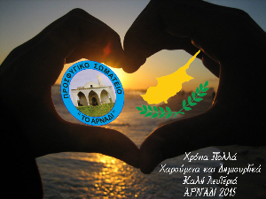 Ο προσωρινός Πρόεδρος και το Συμβούλιο του Προσφυγικού Σωματείου «Το Αρναδί» σας εύχονται ολόψυχα υγεία, χαρά και ευλογία για το Νέο Έτος 2015, με την ελπίδα να φέρει μαζί του κάτι πολύ καλύτερο για τις οικογένειές σας και την πατρίδα μας ώστε όλοι ενωμένοι στον κοινό αγώνα, να πετύχουμε την Ελευθερία της.