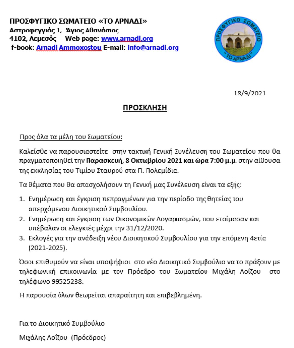 Ως τόπος διεξαγωγής προτείνεται το κέντρο «Ποσειδώνιο» στις Αγγλισίδες για να εξυπηρετεί όλους τους συγχωριανούς. Θα αποσταλεί σχετικό μήνυμα το οποίο θα αναρτηθεί και στην Ιστοσελίδα του χωριού. Οι ενδιαφερόμενοι για εγγραφή ως νέα μέλη ή ως υποψήφιοι του Συμβουλίου θα πρέπει να αποτείνονται στον Πρόεδρο του Κοινοτικού Συμβουλίου κ Γεώργιο Χριστοδούλου (Τηλ. 99878375), ή στον προσωρινό πρόεδρο του Προσφυγικού Σωματείου «Το Αρναδί» κ Σωτήρη Κατράνη (Τηλ. 99481400).