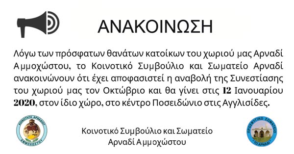 Τα μέλη του Κοινοτικού Συμβουλίου και Σωματείου ΑΡΝΑΔΙ Αμμοχώστου, ευχαριστούν θερμά όσους τίμησαν με την παρουσία τους την εκδήλωση.